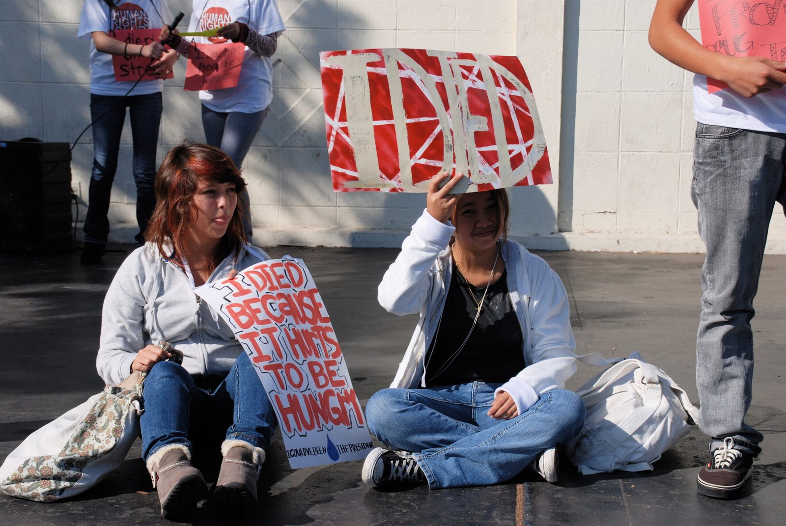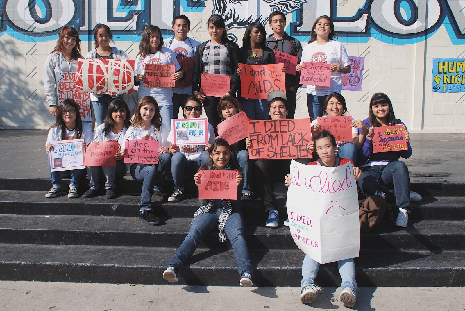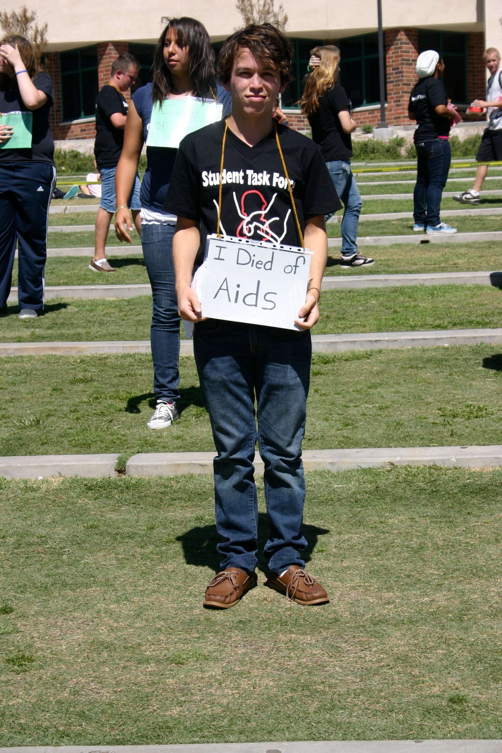 September 22, 2009: Canyon STF created awareness of children’s rights violations around the world by staging a Die-In.  Students lay on campus with signs that signified different ways to die from these violations: “I died of AIDS”, “I died as a child soldier”, “I died of a preventable disease”, etc.  The event garnered attention from the student body and STF students were able to begin educating their peers about the urgent need to protect children’s rights.