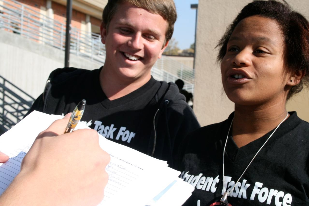 November 16-20, 2009: On Monday, STF students gathered signatures from the school’s administrators and teachers. The students then made classroom presentations where they described the CRC and gathered signatures of support. On Friday, the students tabled during lunch as several STF members walked around the campus collecting signatures. Each student who signs during the lunch activity received a sticker that says, “I signed in support of the CRC today! Children count!”