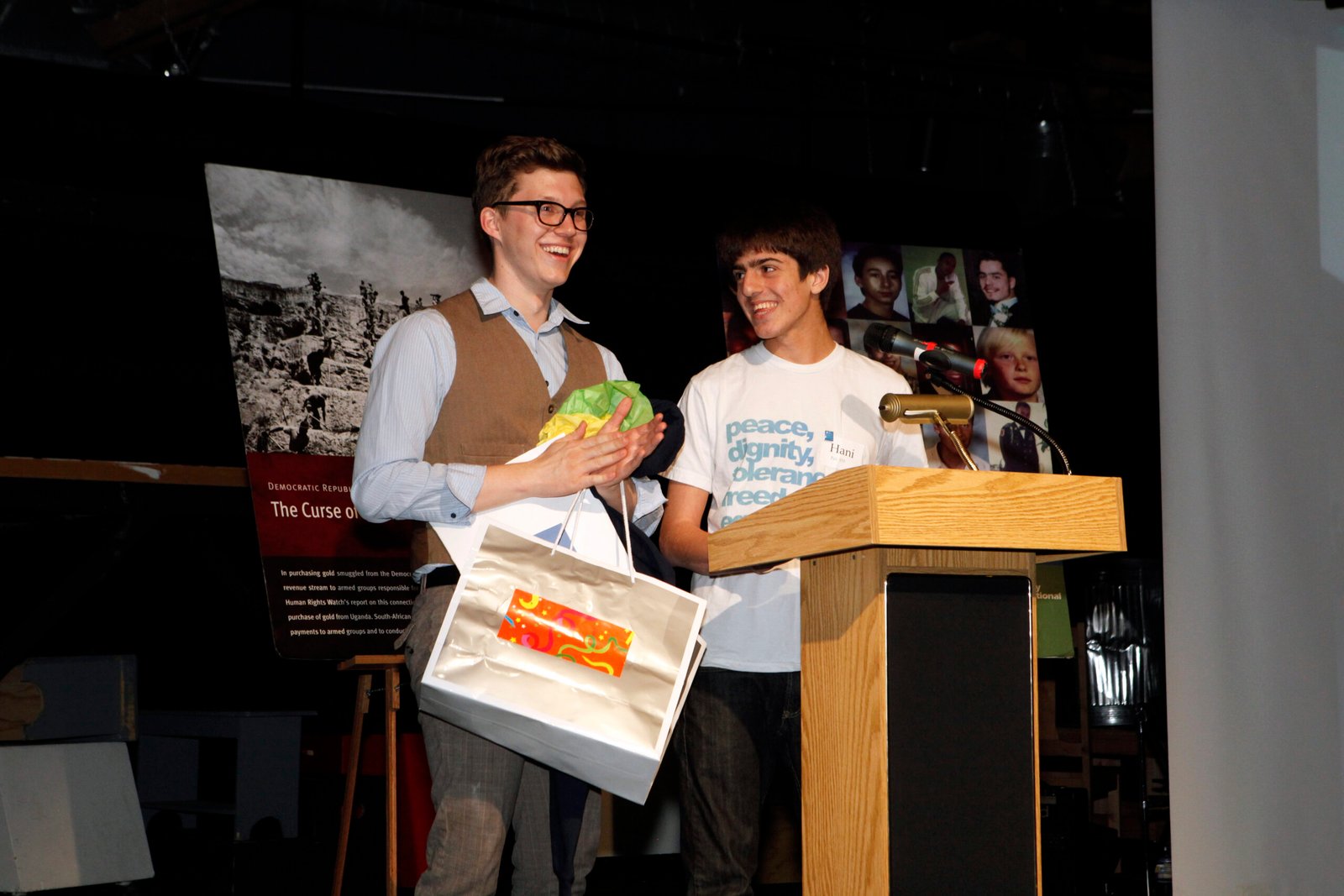 November 17, 2009: STF infused the HRW Annual Dinner with art work by Brooke Greenberg (Pali STF) and live jazz music by Steven Gordon (SAMO STF).  STF students met this year’s honorees Elena Milashina and Daniel Bekele and discussed student activism in their own countries among other topics. STF also asked HRW guests to sign letters to Senator Boxer and Secretary of State Clinton urging U.S. ratification of the Convention on the Rights of the Child. The dinner, emceed by Morgan Freeman, was filled with inspiring stories and updates from Human Rights Watch researchers.